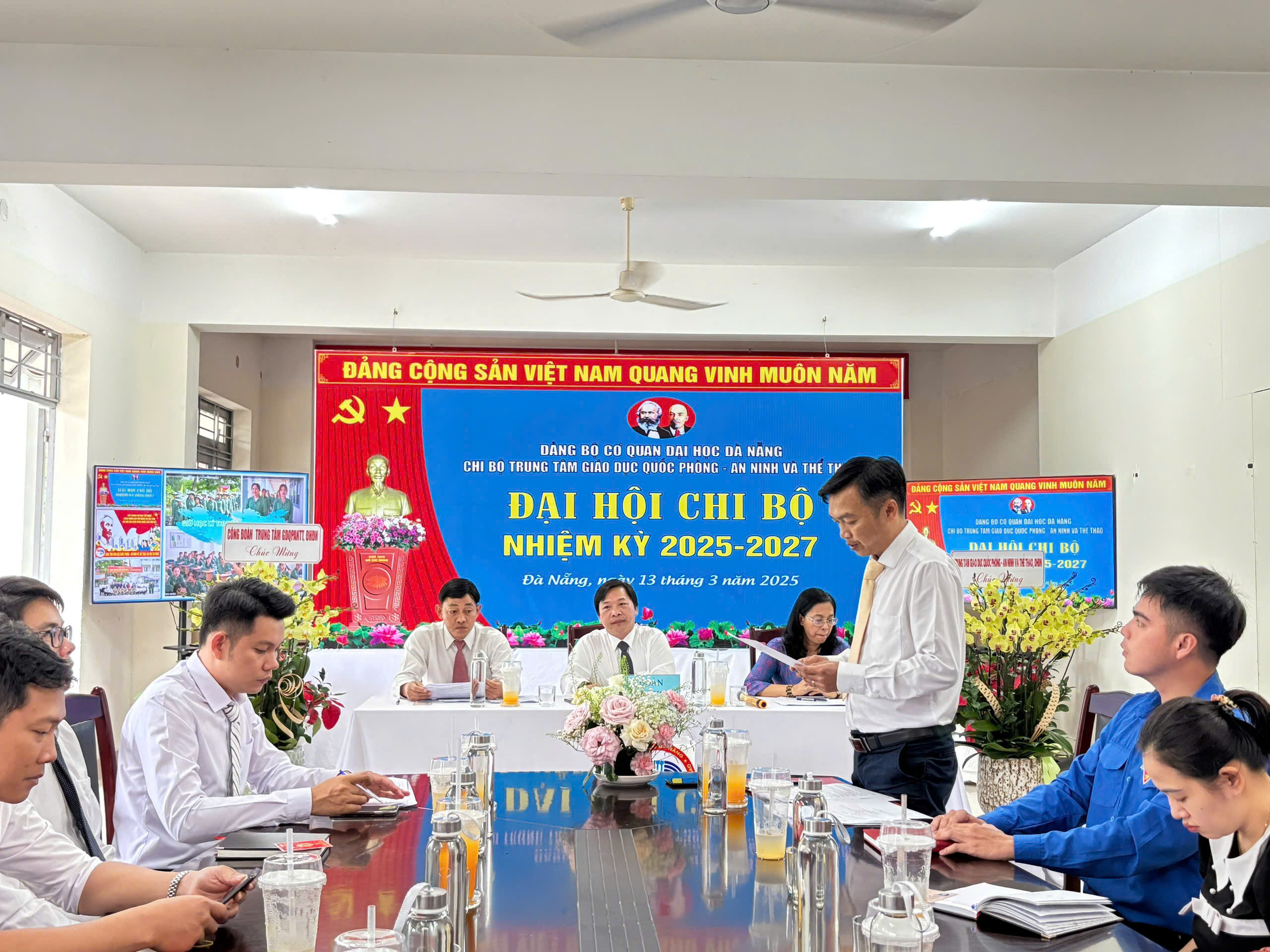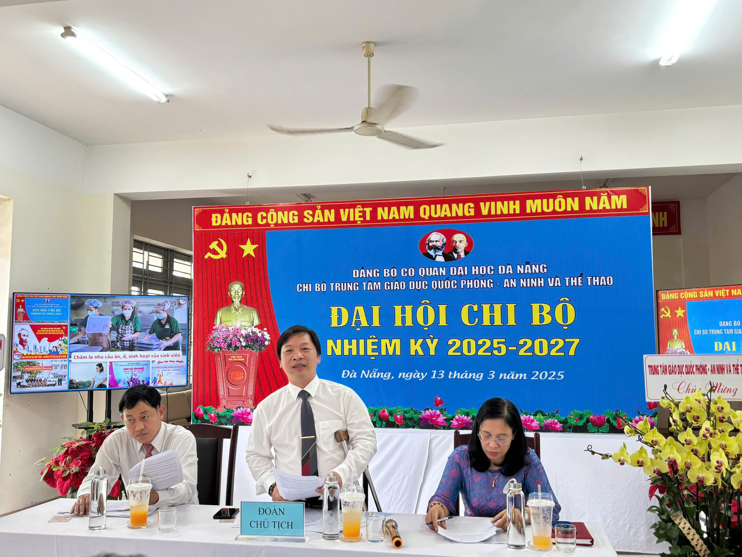 Chiều ngày 13/3/2025, Chi bộ Trung tâm Giáo dục Quốc phòng – An ninh và Thể thao (GDQPANTT), Đại học Đà Nẵng (ĐHĐN) đã tổ chức thành công Đại hội Chi bộ nhiệm kỳ 2025-2027. Đại hội diễn ra trong không khí trang nghiêm, dân chủ và thẳng thắn, mang tính xây dựng cao; thể hiện quyết tâm tiếp tục phát huy những thành quả đã đạt được và khắc phục những khó khăn, tồn tại trong công tác lãnh đạo trong thời gian tới.