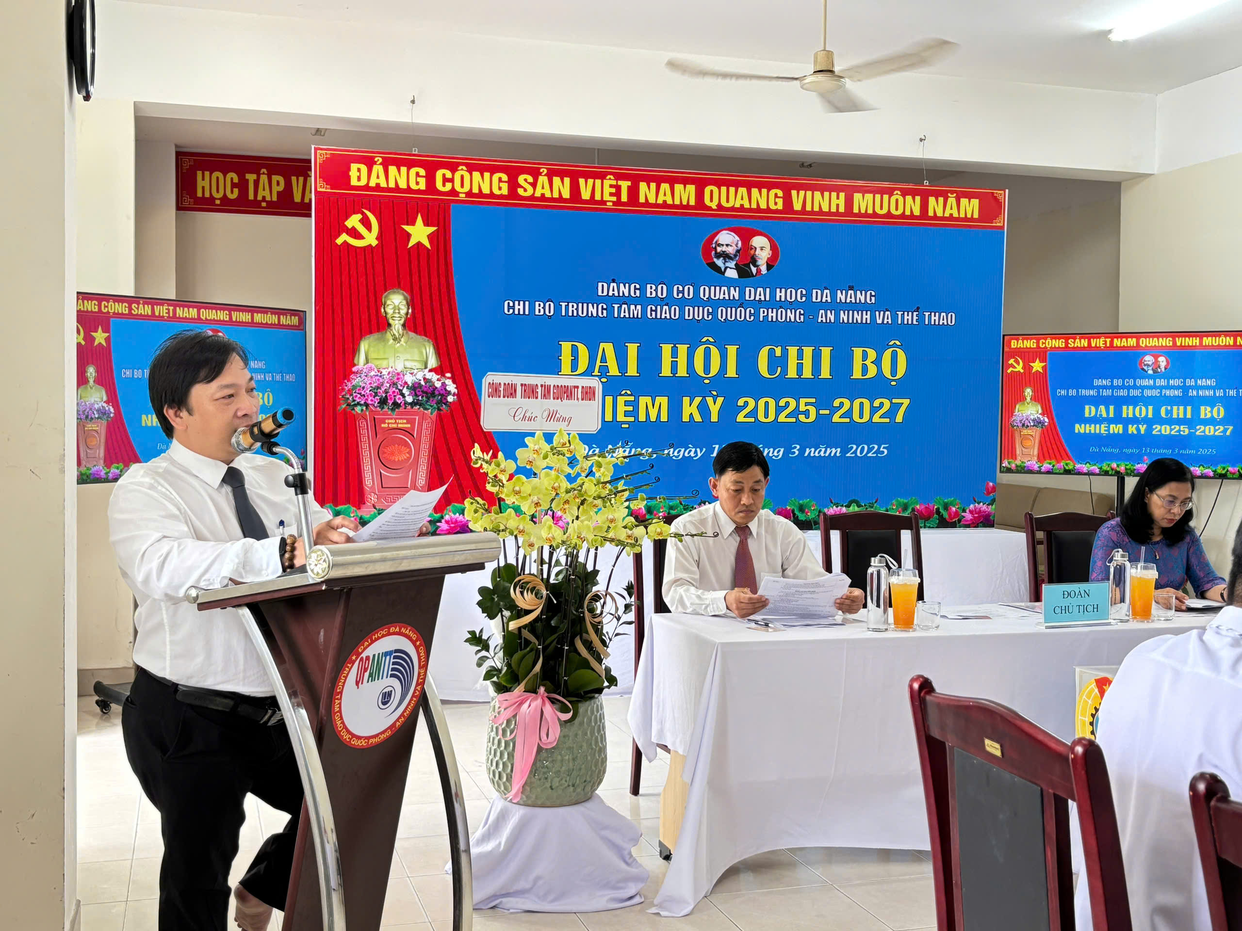 Tham dự và phát biểu tại Đại hội, đồng chí Hồ Phan Hiếu – Ủy viên Ban Thường vụ Đảng ủy cơ quan ĐHĐN đánh giá cao những kết quả mà Chi bộ Trung tâm GDQPANTT, ĐHĐN đã đạt được trong nhiệm kỳ 2022-2025. Đồng chí nhấn mạnh, trong nhiệm kỳ 2025-2027, Chi bộ cần tiếp tục phát huy vai trò lãnh đạo trong việc tham mưu cho Ban Giám đốc ĐHĐN về các lĩnh vực do đơn vị mình phụ trách; đồng thời tổ chức thực hiện và quản lý tốt các công việc được giao, phát huy tính năng động sáng tạo trong quá trình thực thi nhiệm vụ của mình, hoàn thành các chỉ tiêu Nghị quyết Đại hội chi bộ nhiệm kỳ 2025-2027. Đồng chí cũng nhấn mạnh thêm, trong nhiệm kỳ mới, Chi bộ cần chú trọng tới một số nội dung sau: