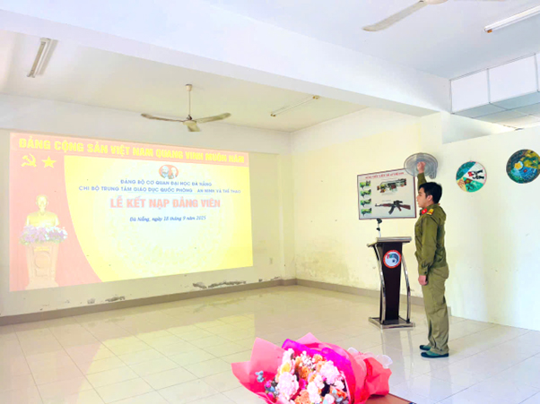 Thấm nhuần lời dạy đó, chiều ngày 18/9/2025, được sự đồng ý của Đảng uỷ Cơ quan ĐHĐN, Chi bộ Trung tâm Giáo dục Quốc Phòng – An ninh và Thể thao (GDQPANTT), Đại học Đà Nẵng (ĐHĐN) long trọng tổ chức Lễ Kết nạp đảng viên cho quần chúng ưu tú Võ Hoàng Vinh – Chuyên viên Phòng Đào tạo và Quản lý sinh viên (ĐT&QLSV), Phó Bí thư Chi đoàn Trung tâm GDQPANTT, ĐHĐN vào Đảng Cộng sản Việt Nam.