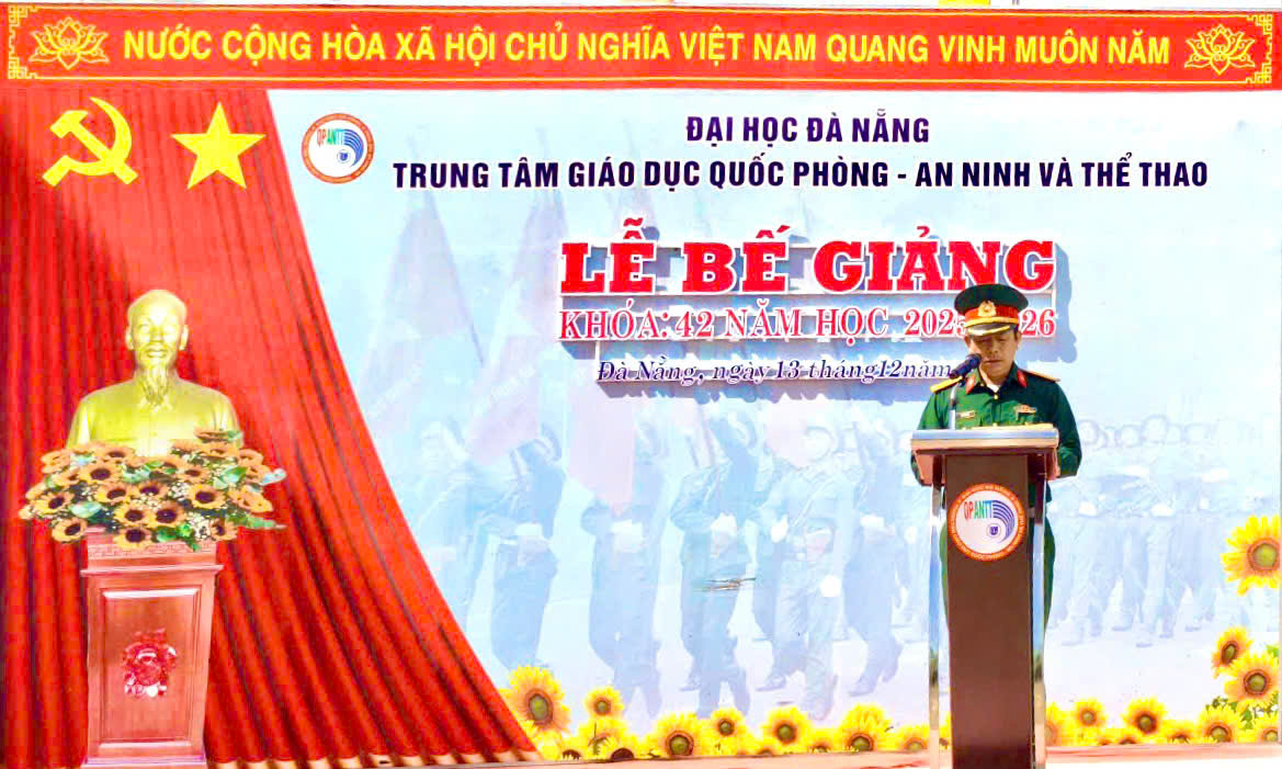 Sáng ngày 13/12/2025, Lễ Bế giảng cho sinh viên Khóa K42 đến từ Trường Đại học Kinh tế (DUE), Đại học Đà Nẵng (ĐHĐN) trang trọng được diễn ra tại Trung tâm Giáo dục Quốc phòng – An ninh và Thể thao (GDQPANTT). Tham dự buổi lễ có TS. Hồ Phan Hiếu – Phó Giám đốc phụ trách Trung tâm, Đại tá Vũ Văn Túc – Trợ lý Trung tâm cùng các thầy cô, cán bộ đại đội và toàn thể sinh viên của Khóa K42.