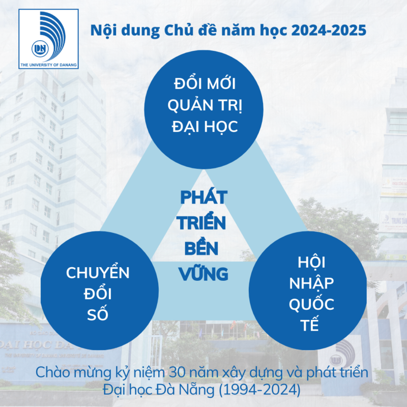 Ngày 29/8/2024, Giám đốc Đại học Đà Nẵng (ĐHĐN) đã ký ban hành Công văn số 3621/ĐHĐN-VP về việc thực hiện nhiệm vụ, giải pháp trọng tâm năm học 2024-2025, quyết tâm thực hiện thắng lợi nhiệm vụ năm học mới với chủ đề: “Tiếp tục đổi mới quản trị đại học gắn với chuyển đổi số và hội nhập…