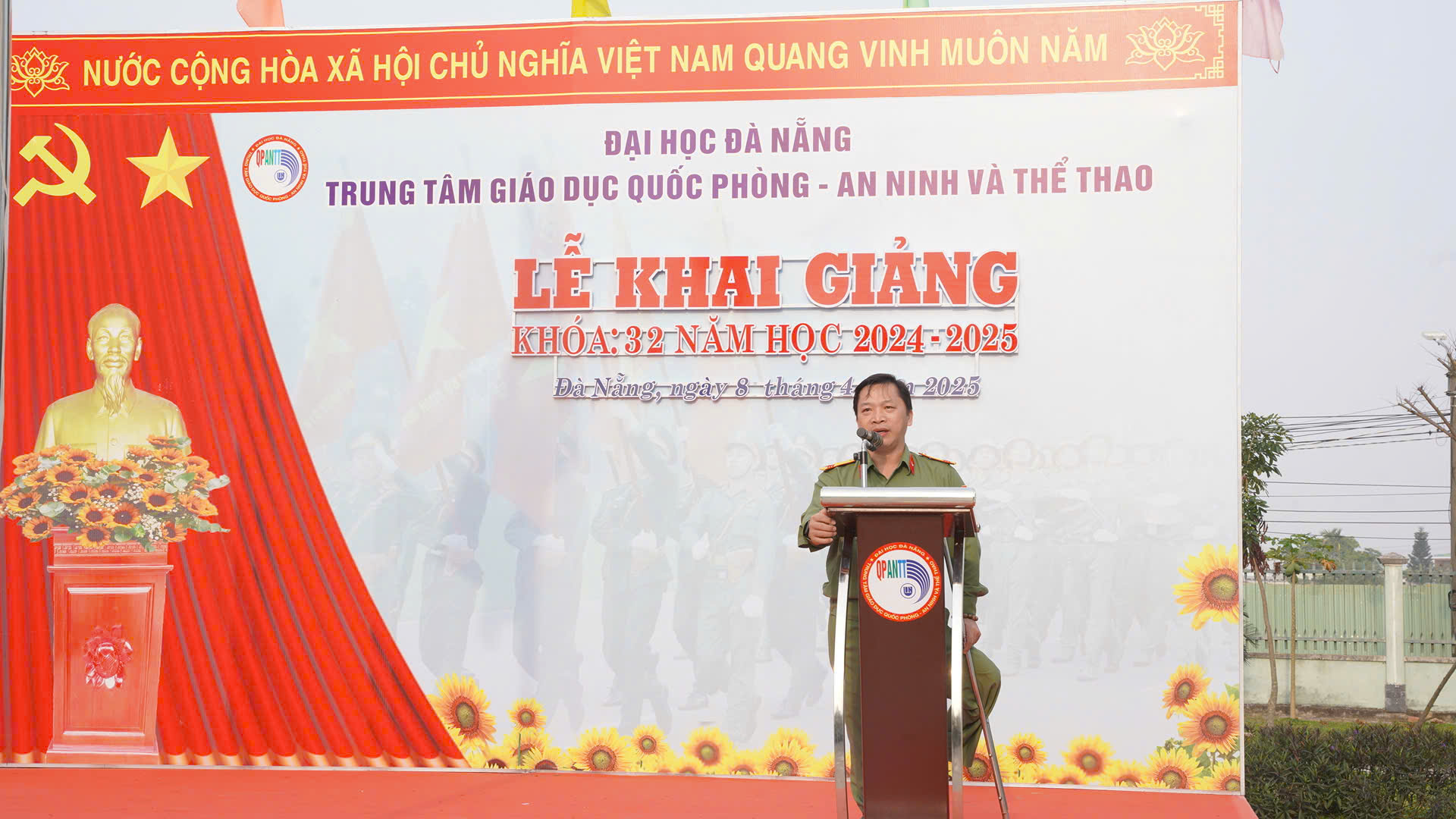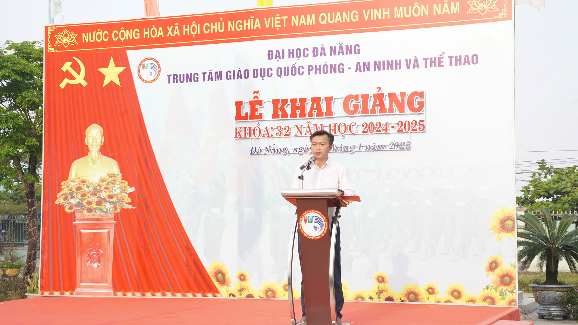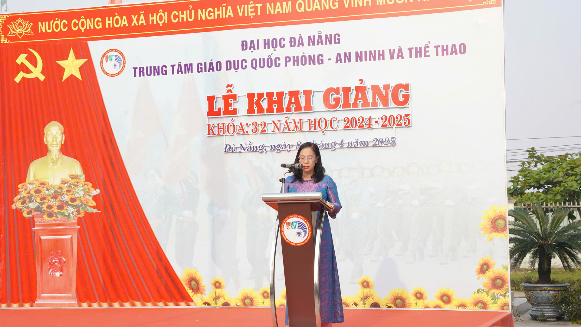 Sau phần nghi thức chào cờ, ThS. Trần Thị Kim Oanh – Phó Giám đốc Trung tâm  đã đọc diễn văn khai giảng khóa học mới của năm học 2024-2025. Trong bài diễn văn, Cô nhấn mạnh Giáo dục quốc phòng và an ninh là nội dung cơ bản trong xây dựng nền quốc phòng toàn dân, thế trận an ninh nhân dân, là môn học chính khóa thuộc chương trình giáo dục đại học; công tác Giáo dục quốc phòng và an ninh của Trung tâm đã thiết thực nâng cao nhận thức, trách nhiệm của sinh viên đối với sự nghiệp xây dựng và bảo vệ Tổ quốc, góp phần củng cố vững chắc trận địa tư tưởng của Đảng trong đội ngũ sinh viên, tích cực góp phần xây dựng “thế trận lòng dân”, tăng cường các tiềm lực của nền quốc phòng toàn dân ở các địa phương trong khu vực và cả nước, thực hiện thắng lợi chiến lược bảo vệ Tổ quốc Việt Nam xã hội chủ nghĩa trong tình hình mới. Trong chương trình học tập, các em còn được trang bị những kỹ năng cơ bản về kỹ thuật chiến đấu bộ binh, chiến thuật từng người trong chiến đấu tiến công, phòng ngự và làm nhiệm vụ canh gác, biết sử dụng súng tiểu liên AK, lựu đạn; thực hiện nghiêm các chế độ trong ngày, trong tuần, được luyện tập đội ngũ đơn vị, hành quân rèn luyện, sinh hoạt tập thể và tham gia các hoạt động ngoại khóa, văn nghệ, thể thao. Đồng thời Cô cũng nhắc nhở các em sinh viên nghiêm túc chấp hành trong sinh hoạt, ăn ở và học tập tại Trung tâm GDQPANTT, ĐHĐN để khoảng thời gian sinh hoạt, học tập môn học Giáo dục quốc phòng và an ninh sẽ đạt kết quả tốt nhất và để lại nhiều kỷ niệm đẹp trong quãng đời sinh viên của các em.